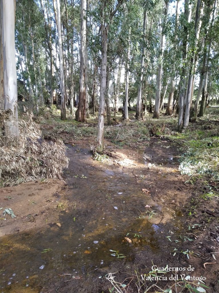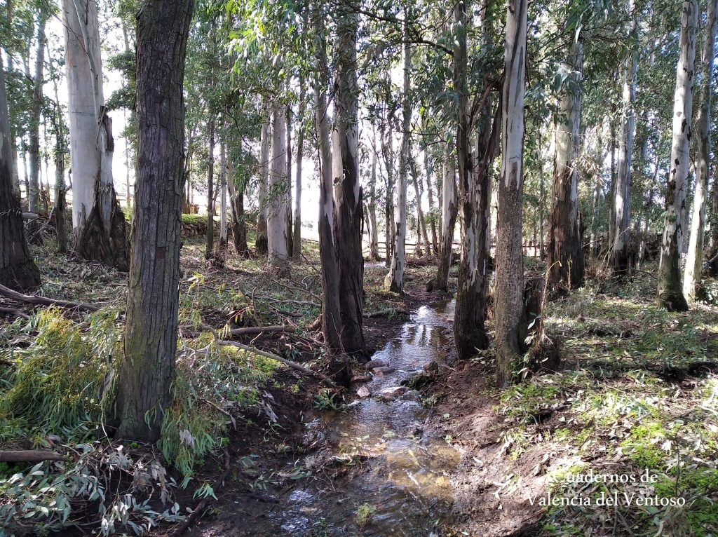 Después de saltar la pista interior de Doña Elvira, el arroyo de la Cueva de la Mora se introduce en el eucaliptal, situado bajo el cortijo de Doña Elvira, y serpentea entre los eucaliptos.