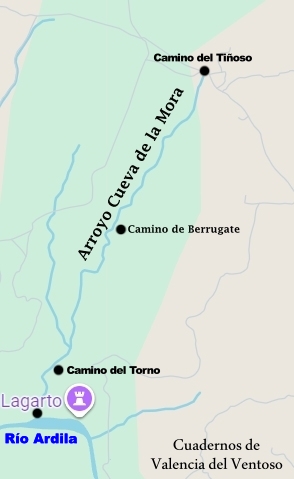 Desde el Camino de Berrugate, el arroyo cogerá una mayor pendiente, al introducirse en la zona rocosa, donde abundan los refugios y abrigos de piedra, y donde se sitúa la renombrada Cueva de la Mora.